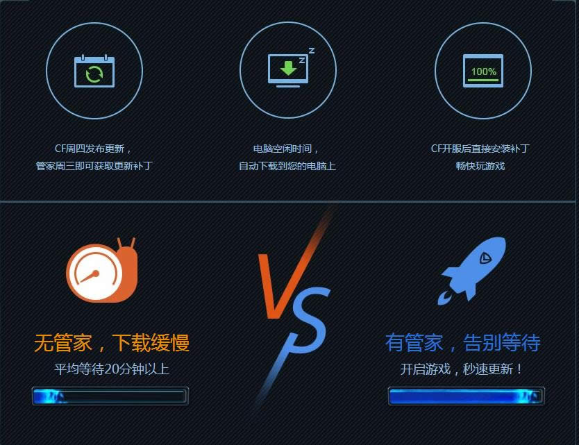 CF周四发布更新,管家周三即可获取更新补丁电脑空闲时间,自动下载到您的电脑上CF开服后直接安装补丁