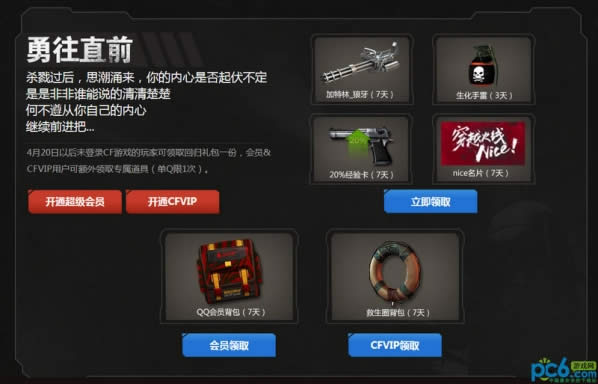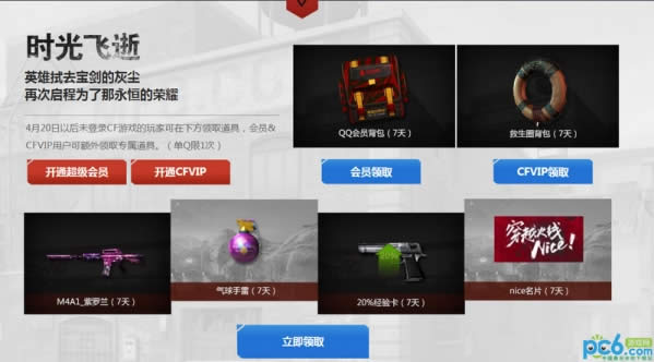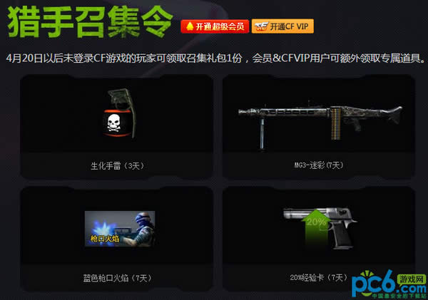 4月20日以后未登录CF游戏的玩家可领取召集礼包1份,会员&CFVIP用户可额外领取专属道具。