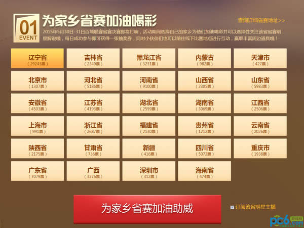 2.2015年5月30日-31日百城联赛省赛决赛即将打响,活动期间选择自己的家乡为他们加油喝彩并可以选择性关注该省省赛明星解说哦,每日成功参与即可获得一张抽奖券,同时小伙伴们也可以前往线下比赛地点进行互动,赢取丰富周边道具哦
