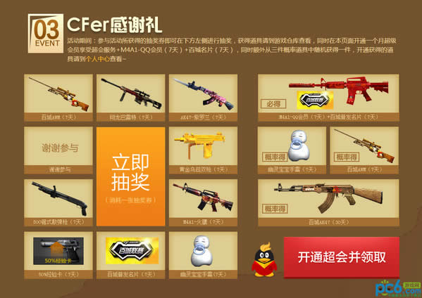 4.活动期间:参与活动所获得的抽奖券即可在下方左侧进行抽奖,获得道具请到游戏仓库查看,同时在本页面开通一个月超级会员享受超会服务+M4A1-QQ会员(7天)+百城名片(7天),同时额外从三件概率道具中随机获得一件,开通获得的道具请到个人中心查看~