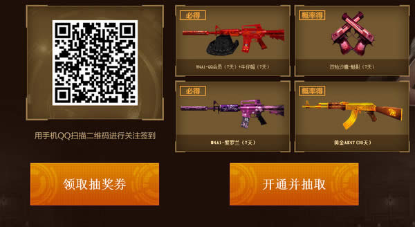 5、活动期间:成功关注并签到CF部落即可领取一张抽奖券用于活动二的抽奖,同时在本页面开通一个月超级会员获得会员服务的同时还可以必得M4A1-QQ会员(7天)+企鹅背包(7天),同时从三件概率道具中随机获得一件,开通所获得的CDK请到个人中心查看并兑换!