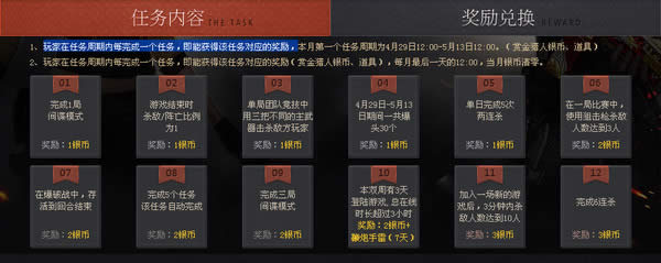 1、玩家在任务周期内每完成一个任务,即能获得该任务对应的奖励,本月第一个任务周期为4月1日12:00-4月15日12:00。(赏金猎人银币、道具)