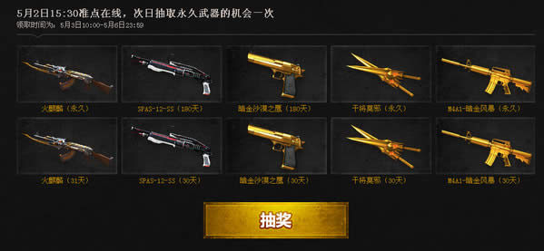 5月2日15:30准点在线,次日抽取永久武器的机会一次;领取时间为:5月3日10:00-5月6日23:59