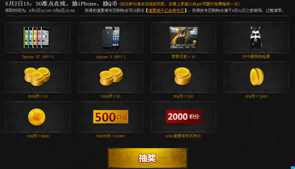 5月2日15:30准点在线,抽iPhone、抽Q币(成功参与准点在线的玩家,在掌上穿越火线APP可额外免费抽奖一次)