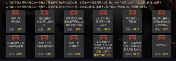 1、玩家在任务周期内每完成一个任务,即能获得该任务对应的奖励,本月第一个任务周期为4月1日12:00-4月15日12:00。(赏金猎人银币、道具)