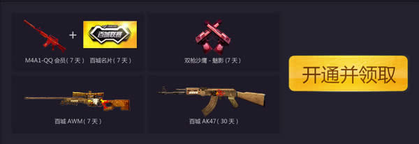 活动期间:在当前页面开通一个月超级会员即可获得M4A1-QQ会员 (7天) +百城名片 (7天), 同时从双枪沙鹰-魅影(7天)、百城AWM(7天)、百城AK47(30天)三件概率道具中随机获得一件!