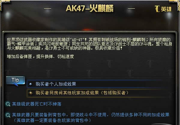 永久性武器AK47-火麒麟。世界顶级武器收藏家制作,该类型武器会给使用者以及同房间玩家增加大量的经验及GP加成,在外观上,装备了麒麟的装甲,前端加装了锋利的麒麟剑,属于永久性武器,外观与性能并重。