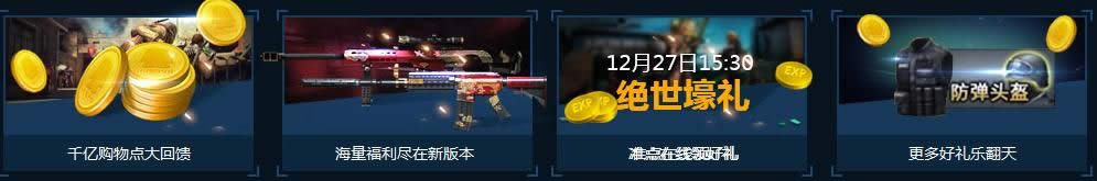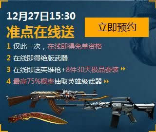 活动时间:即日起到活动结束 活动内容介绍: 12月27日15:30准点在线送 1、仅此一次,在线即得免单资格 2、在线即得绝版武器 3、在线即送英雄枪+8件30天极品套装 4、最高75%概率抽取英雄级武器