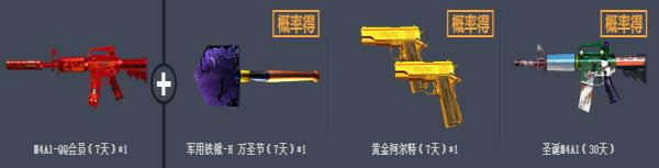 开通一个月超会必得M4A1-QQ会员(7天),同时还可概率获得军用铁锹-万圣节(7天)、黄金柯尔特(7天)和M4A1圣诞节(30天)