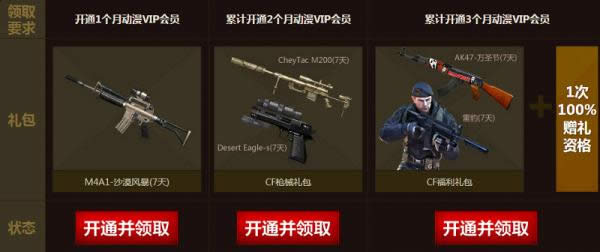 活动期间通过在当前页面开通或续费VIP会员,根据累计开通月份,可领取对应的CF礼包!10Q币即可开通1个月动漫VIP,还送超值礼品哦!礼品数量有限,先到先得。