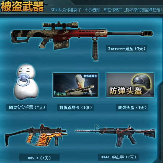 活动规则: 1、活动时间:2014年4月16日-2014年12月31日 2、活动期间,每位用户均有一次抢回武器的机会,有机会获得强力道具。 3、若对本活动有任何咨询或疑问,请联系在线客服 4、由于不可抗力因素、网络、作弊等非腾讯公司原因导致活动出现异常情况,腾讯公司有权采取调整、暂停措施;腾讯公司保留在法律规定范围内对上述规则进行解释的权力
