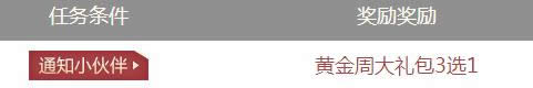 9月30日-10月7日,玩家成功通知小伙伴即可从三份黄金周大礼包中选择一份领取