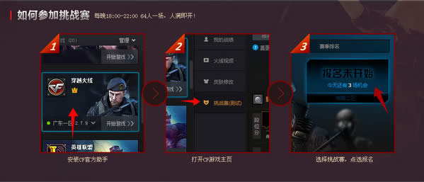 cf官方助手T Fire挑战赛及奖励介绍: 下载腾讯CF官方助手后,可在每晚18:00-22:00参与T Fire挑战赛,64个人一场,人满即开。 流程: 安装CF官方助手 打开CF游戏主页 选择挑战赛,点选报名