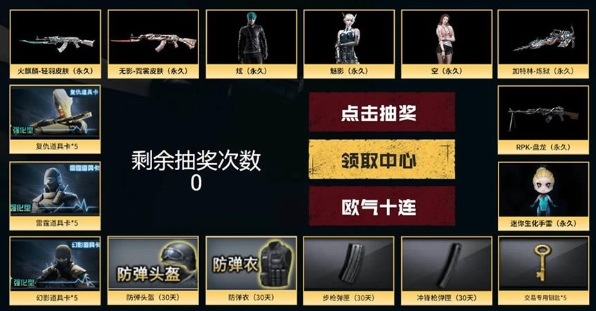 端游:火麒麟-轻羽皮肤(永久)总限量1300,无影-霓裳皮肤(永久)总限量1300,炫(永久)总限量1300,魅影(永久)总限量1300,空(永久)总限量2000,加特林-炼狱(永久)总限量2000,RPK-盘龙(永久)总限量2000,迷你生化手雷(永久)总限量3000;