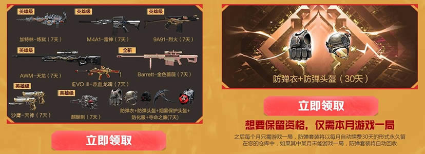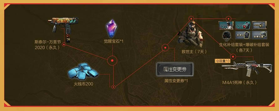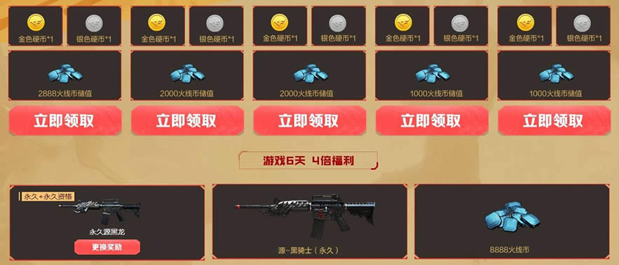 活动期间,累计游戏天数兑换对应奖励,累计火线币储值额度。累积火线币额度累积游戏5天后可以领取。领取源武器的永久及永久 资格后,之后只需每月游戏1次,累计5个月(11月、12月、明年1月、2月、3月),即可一直保留该永久道具。