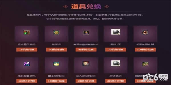 1.在直播期间,每个QQ账号观看1分钟便可获得1积分,职业联赛1个直播日最高上限50积分,该积分可以用来兑换珍贵游戏道具。黑钻、疲劳药水等你拿!