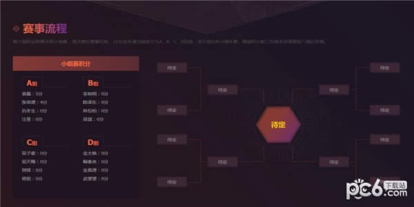2.第六届职业联赛采用小组赛、淘汰赛的赛事机制。16名选手通过抽签分为A、B、C、D四组,进行组内BO3循环赛。每组积分前二的选手获得晋级八强的资格。