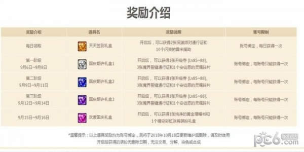 【3】温馨提示:以上道具奖励均为账号绑定,且将于2018年10月18日更新维护后删除,请及时使用开启后获得的装扮无删除日期,无法交易、分解、染色或合成