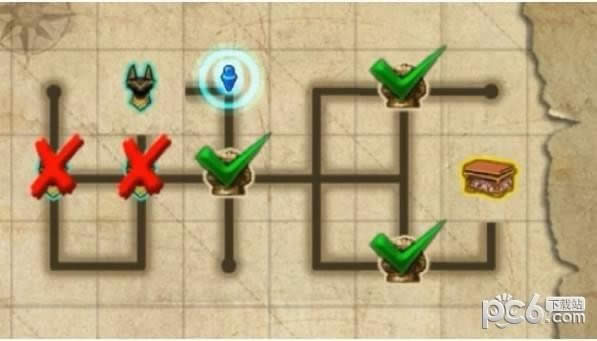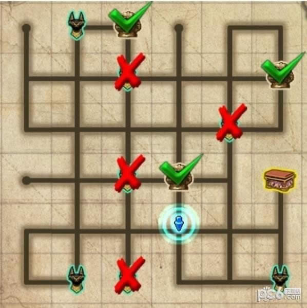 地图上狗头表示陷阱,陷阱内容下个环节讲解。奖励:通过陷阱后将随机从 显示地图构造(不包括神像及陷阱位置)、显示2个陷阱位置、显示2个神像位置