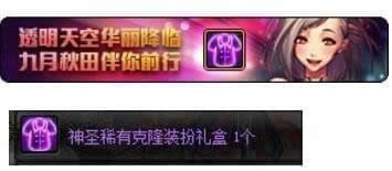 开启后,可以选择获得1个部位的稀有克隆装扮。温馨提示:本次加入神圣稀有克隆装扮礼盒获得概率