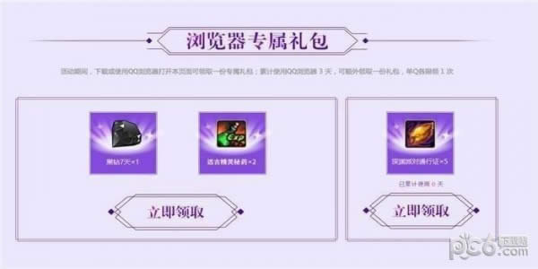 活动期间,下载或使用QQ浏览器打开本页面可领取一份专属礼包;累计使用QQ浏览器3天,可额外领取一份礼包,单Q各限领1次