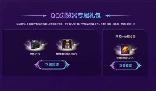 2.活动期间,下载或使用QQ浏览器打开本页面可领取一份专属礼包;累计使用QQ浏览器3天,可额外领取一份礼包,单Q限领1次