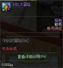 4.托比大冒险(称号)为无属性的活动称号,稀有等级,无法合成,账号绑定。