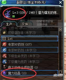 好,我们先在炼金1级的时候使用魔力结晶设计图。然后打开系统菜单,打开副职业,开始我们的炼金制作。1级到3级时,我们只制作魔力结晶。材料为生命之息和下级元素结晶。大概点击生产240个魔力结晶,就可以到达3级炼金等级。