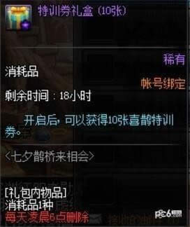 训券礼盒 (10张)开启后,可以获得10张喜鹊特训券。喜鹊特训券可用于参加活动[七夕鹊桥来相会]。