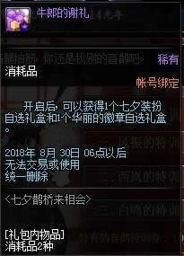 牛郎的谢礼开启后,可以获得1个七夕装扮自选礼盒和1个华丽的徽章自选礼盒。