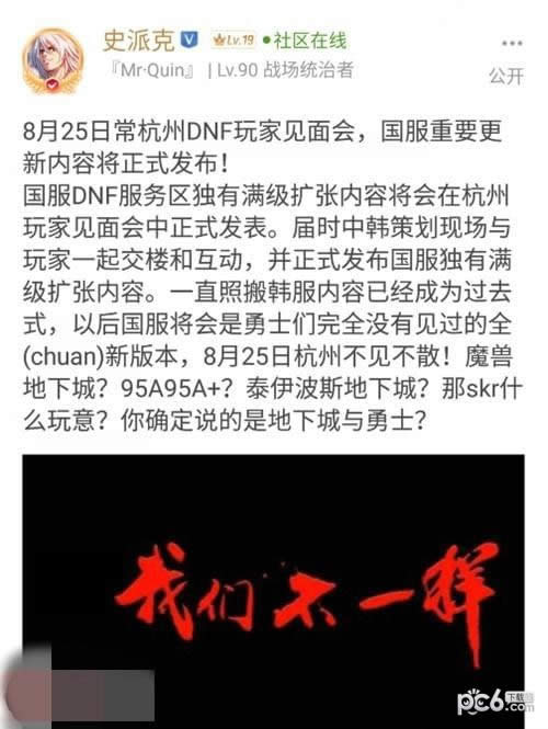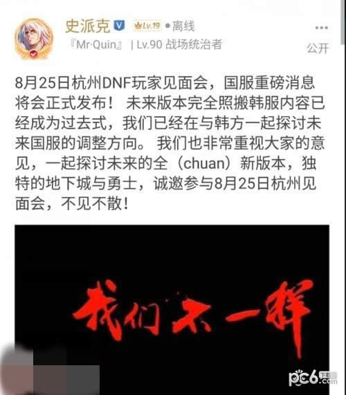 今天史派克公布了在8月25日杭州DNF玩家见面会上将会公布国服独有的满级扩张内容。