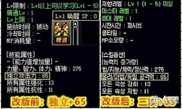 第一项便利性改版就是全职业被动技能的加强。自从称号簿属性被删除之后,全职业就多了一个叫做唤醒的被动技能。在改版之前,这个技能只增加了65点独立攻击力,但是改版之后,就变成了三攻+65,也就是物魔攻都增加了65,这样改版的提升堪比一颗卡恩宝珠!