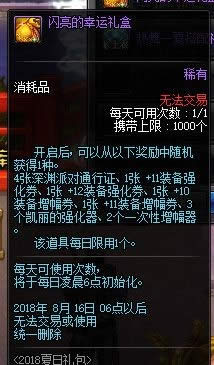 闪亮的幸运礼盒,可从深渊派对通行证、+11装备强化券、+12装备强化券、+10装备增幅券、+11装备增幅券、凯丽的强化器、一次性增幅器等道具中随机获得1种。每日限用1个。