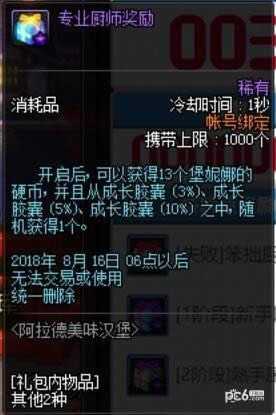 开启后,可以获得13个堡妮娜的硬币,并且从成长胶囊 (3%)、成长胶囊 (5%)、成长胶囊 (10%) 之中,随机获得1个。