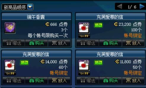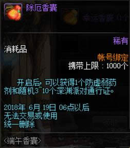 端午节小长假第1天(6月16号)商城限时上架[端午香囊(3个)],售价666点券,仅能使用点券购买。