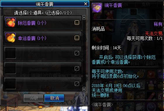 每天可打开1次端午香囊,开启后可以在[除厄香囊]和[幸运香囊]中选择获得1个。
