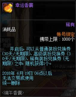 幸运香囊为装扮兑换券香囊,随机获得30天/无期限的低级/高级装扮兑换券或稀有装扮兑换券。