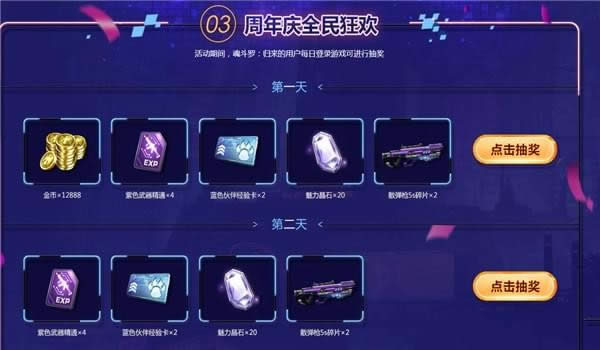 4、全民狂欢:每日登录游戏后,可依次进行抽奖,随机活动奖励,累计4天。