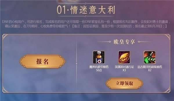 2.确认受邀后,在7月期间,心悦免费带你吸欧气!【备注:因签证原因,需至少有一次出国经历;报名截止到6月20日;】在规定的时间登录游戏即可领取行程礼包