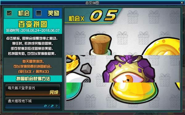 地下城获得5次拼图游戏机会,完成各种颜色袖珍罐的拼图后以及拼图失败,可以获得相应的奖励
