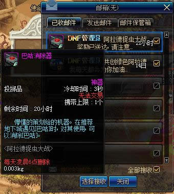 首先每天上线我们会收到一封阿拉德捉虫大战活动的系统邮件,里面有一个“巴咕消除器”,每天凌晨6点删除,但是每天系统都会发一个就是了,每天上线记得领一下,否则捉不了虫子= =