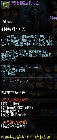 开启后, 可以获得10枚复活币、 10个装备品级调整箱、 4个装扮合成器、 4个黄金蜜蜡和300个宠物饲料。