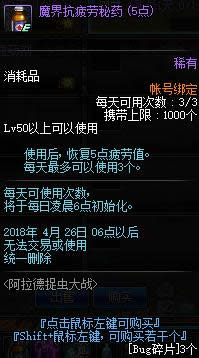 1.活动期间,Lv17及以上勇士登录会获得一个【巴咕消除器】,每个登录角色会均会获得每消耗15疲劳,会在地下城中遇到巴咕,对其使用【巴咕消除器】可以消除巴咕每次击杀一个巴咕可以获得3个bug碎片,每日可遇到3次巴咕