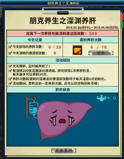 1.活动期间,勇士们账号每累计消耗200张深渊派对邀请函,即可获得一次养肝的机会每日最多可以获得20次机会,每日凌晨6点刷新机会