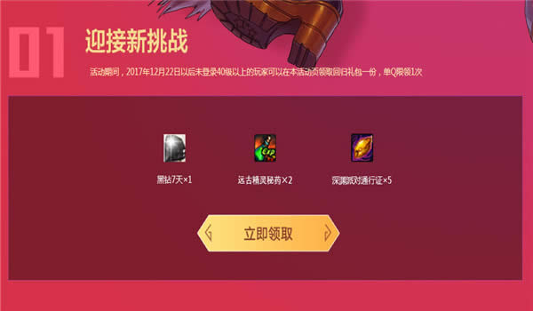 活动期间,2017年12月22日以后未登录40级以上的玩家可以在本活动页领取回归礼包一份,单Q限领1次