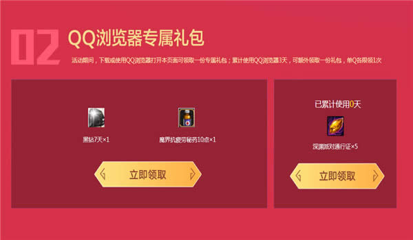2.活动期间,下载或使用QQ浏览器打开本页面可领取一份专属礼包;累计使用QQ浏览器3天,可额外领取一份礼包,单Q各限领1次