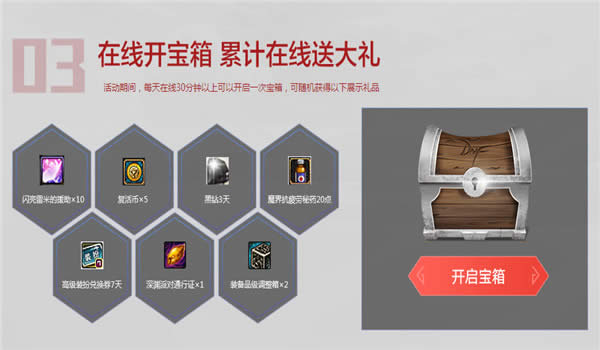 3.活动期间,每天在线30分钟以上可以开启一次宝箱,可随机获得以下展示礼品