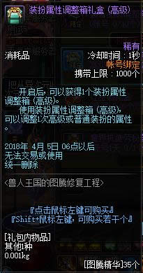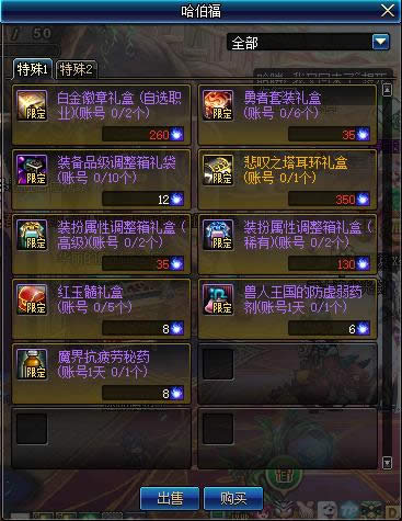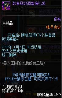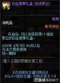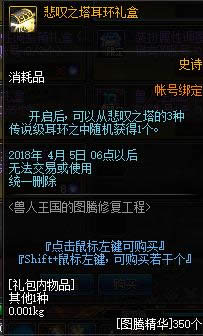 活动获得的图腾精华直接发到背包内,可以在赛丽亚房间内新增NPC“哈伯福”处兑换奖励!其中最令人瞩目的就是自选职业的两个白金徽章礼盒啦!另外耳环礼盒开出的是传说耳环,属性都是非常好的,有小号的话刚好可以用得上~