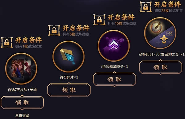 6.拥有1枚试炼勋章即可获得自选7天皮肤+英雄、拥有5枚试炼勋章即可获得符石碎片X1、拥有15枚试炼勋章即可获得3胜经验加成卡 X1、拥有25枚试炼勋章 可随机获得圣杯印记 X50 或 武神之令 X1。