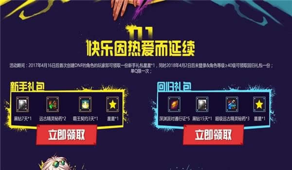 2017年11月16日,创建DNF角色的玩家即可领取一份新手礼包,同时2017年11月2日后登入的玩家>或等于40级可以领取回归礼包一份。